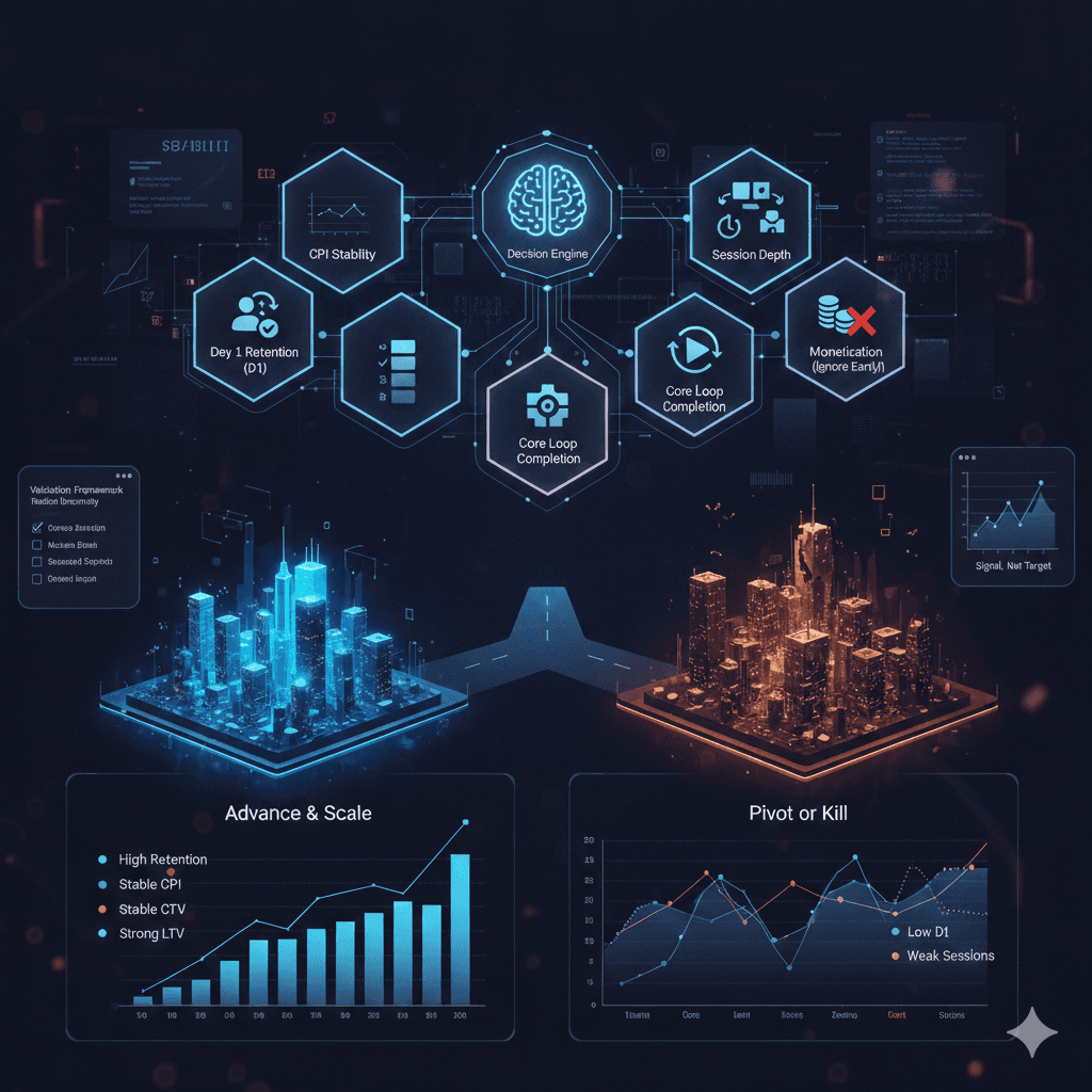 Run soft-launch or initial test campaigns. A/B test creatives, targeting, bid strategies, and geos. Analyze CPI, IPM, ROAS, retention, and creative winners to refine strategy. Scale the best-performing channels and creatives.